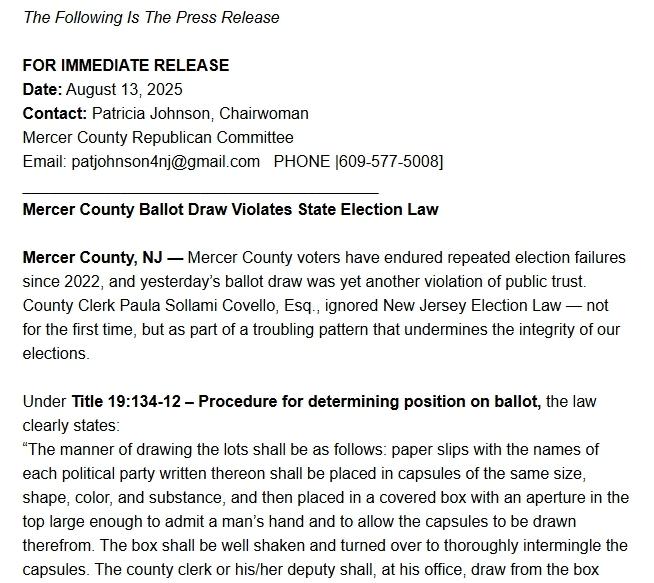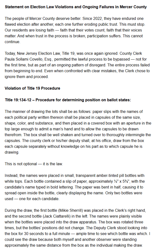 PERSISTENT ELECTION INTEGRITY ISSUES IN MERCER COUNTY DEEPEN WITH LATEST TITLE 19 VIOLATION